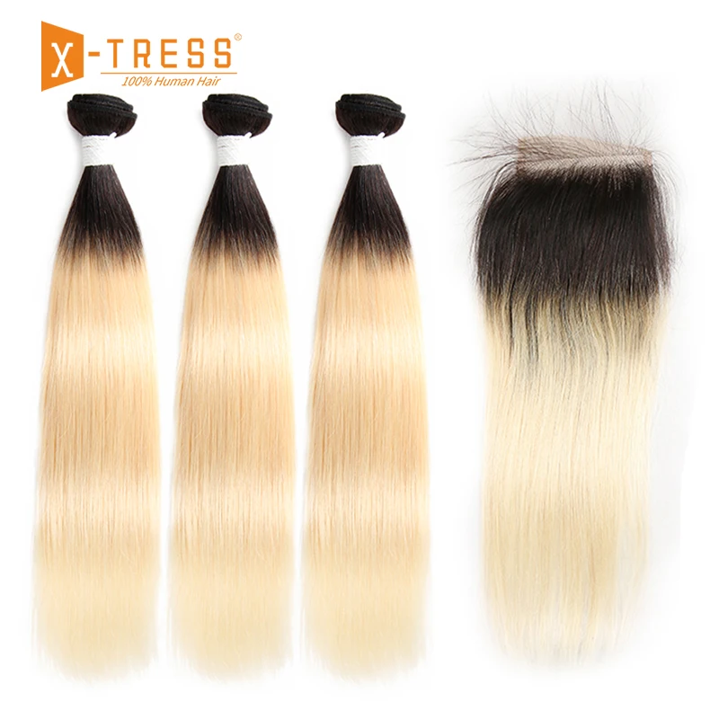 Brazilian Straight Human Hair Weaves With Lace Closure X-TRESS Honey Blonde 613 Ombre Color Non-rem