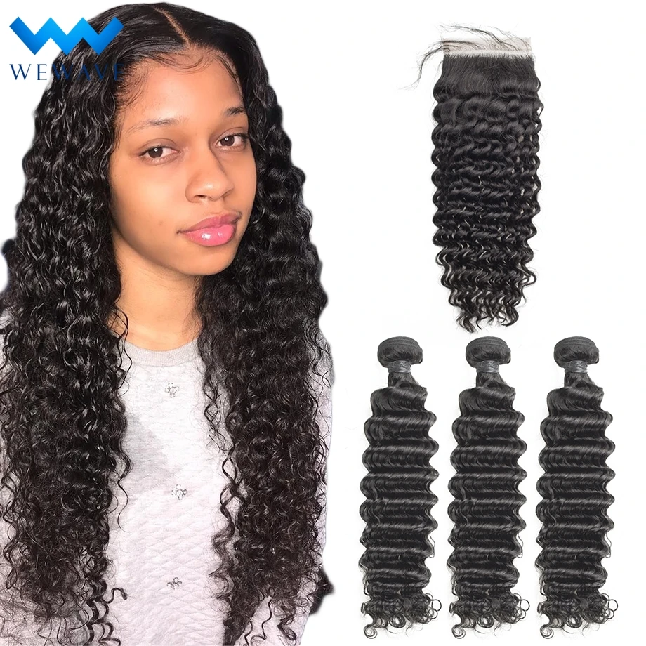 Discount deep curly wave 3 bundles with closure brazilian hair weave bundles short long virgin natural human